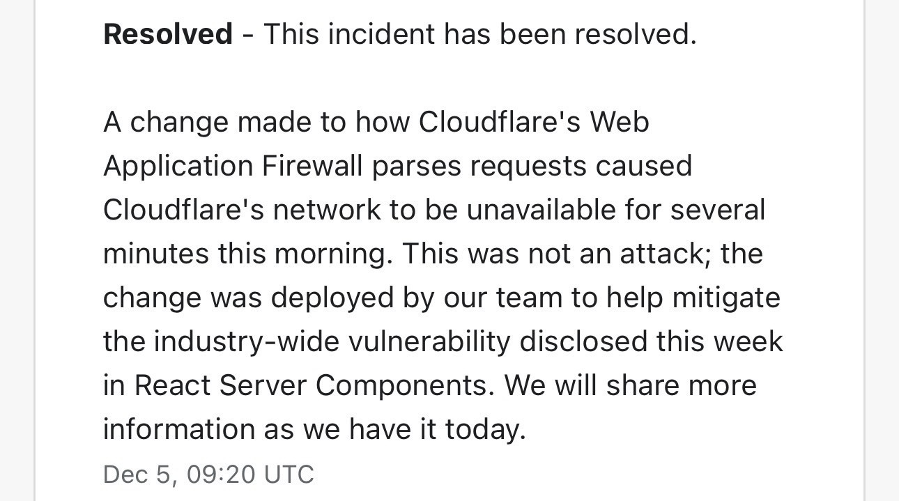 We have our first victim of overreacting to the React vuln - the Cloudflare global outage was them taking down their own service while trying to spot an actually very niche vuln.